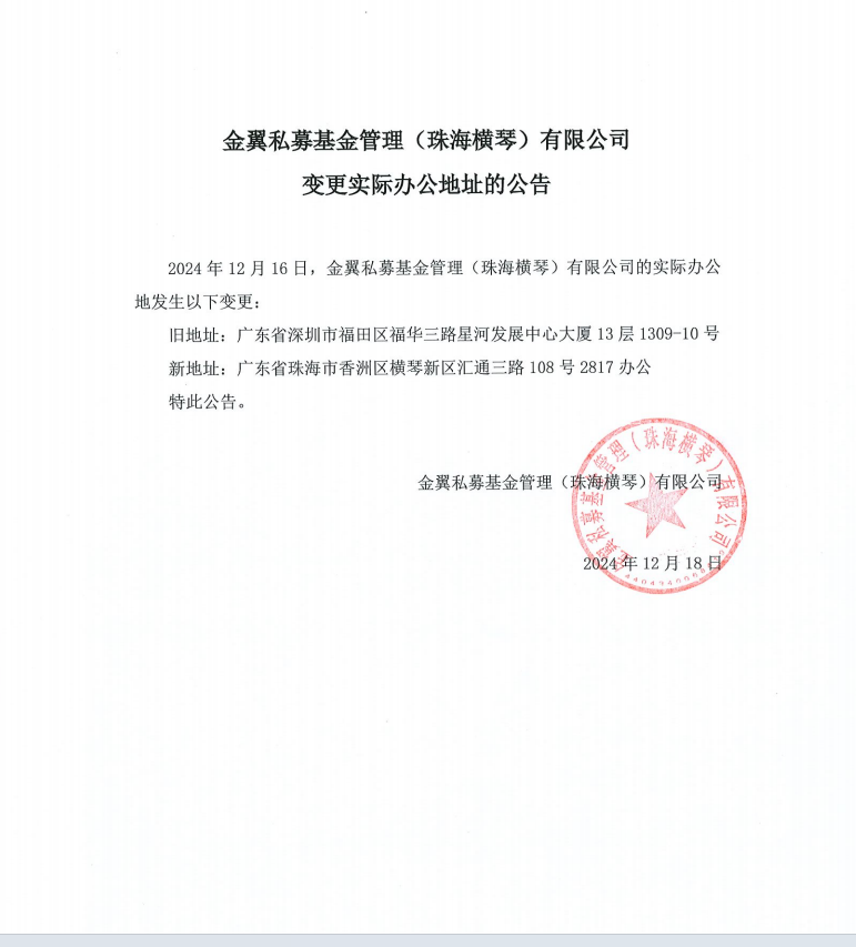 金翼私募基金管理(珠海横琴)有限公司变更实际办公地址的公告
