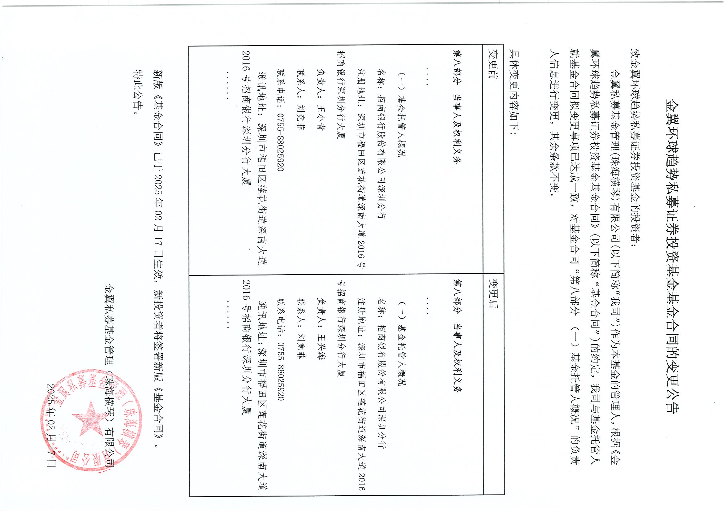 金翼环球趋势私募证券投资基金基金合同的变更公告
